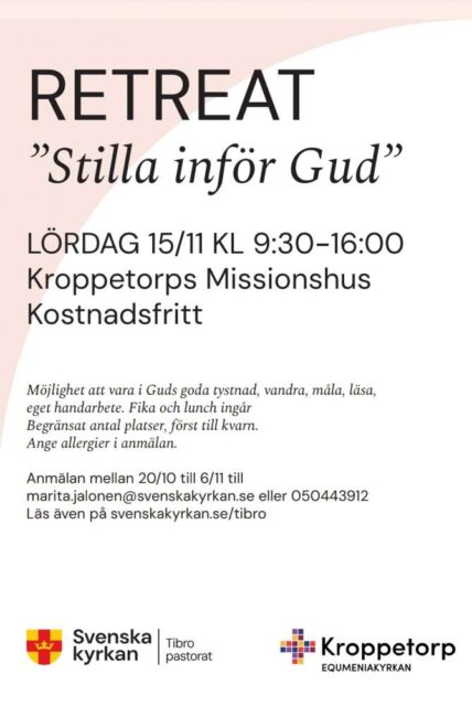 Detta evenemang har redan ägt rum. 15 november, 2025 09:30 - 16:00 Ekumenisk retreatdag i Kroppetorp Lägg till i kalender Google Kalender iCalendar Outlook 365 Outlook Live Dela